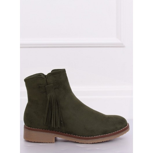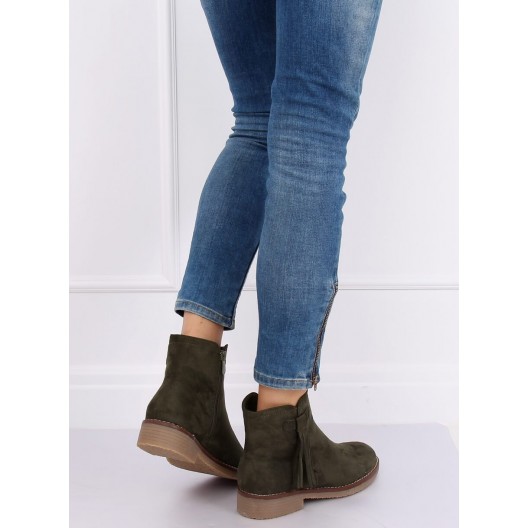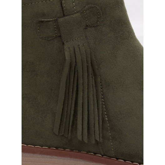 Trendy dámske zelené semišové členkové čižmy s ozdobnými strapcami