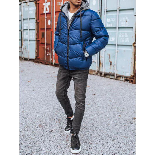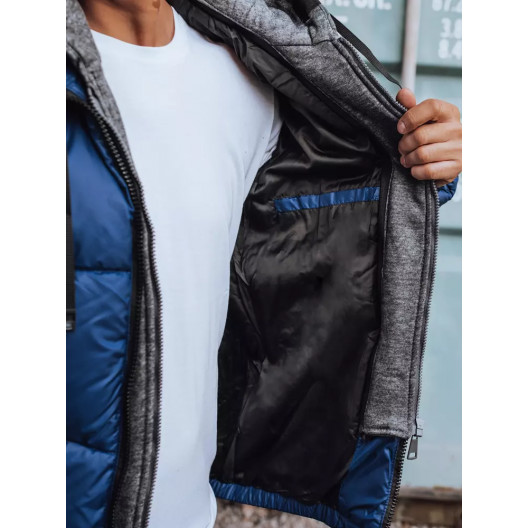 Trendy pánska modrá prešívaná bunda s kapucňou