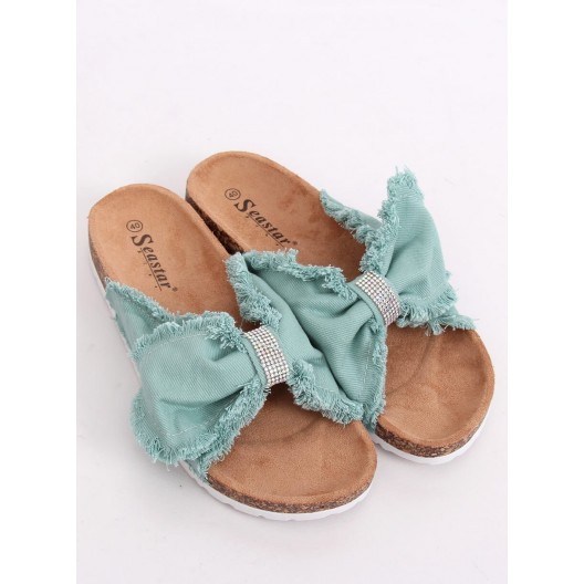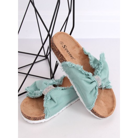 Štýlové dámske zelené šľapky s trendy mašľou a zirkónmi